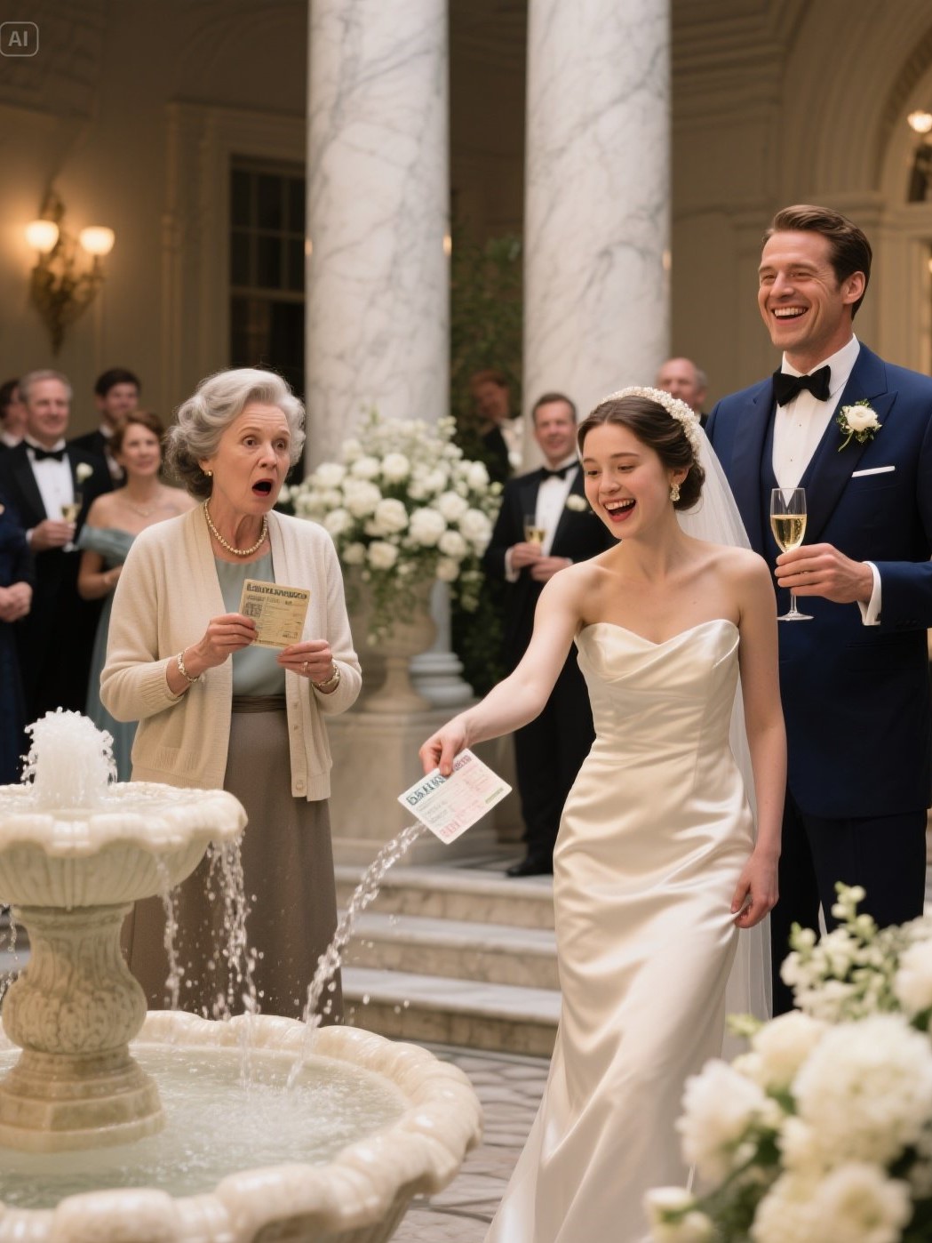 Knjižica je nakratko plutala, gutala šampanjcem obojenu vodu. Pogledi su se zabeleli, neko je dobacio nešto prigušeno, smeh je ispratio eho. Majka — u svojoj “dobroj” Macy’s haljini — izula je cipele, zakoračila u hladan mlaz i izronila kožu natopljenu godinama odricanja. Kap po kap, put ka parkingu. Zvanice su se već vratile na priče o letnjim kućama i portfeljima. Niko nije znao da je to bio početak.
